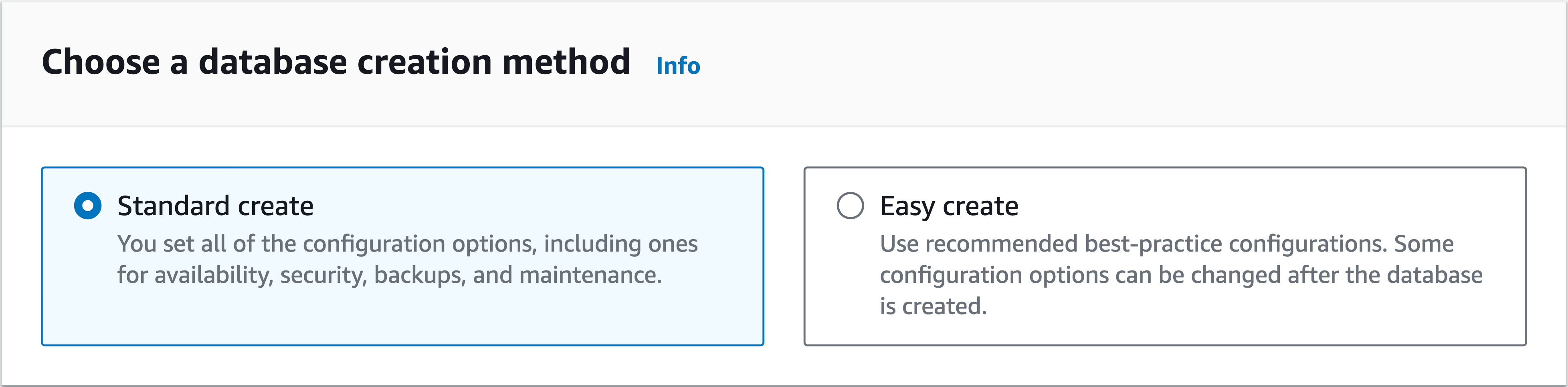 Choose the Standard method for creating a database instance: