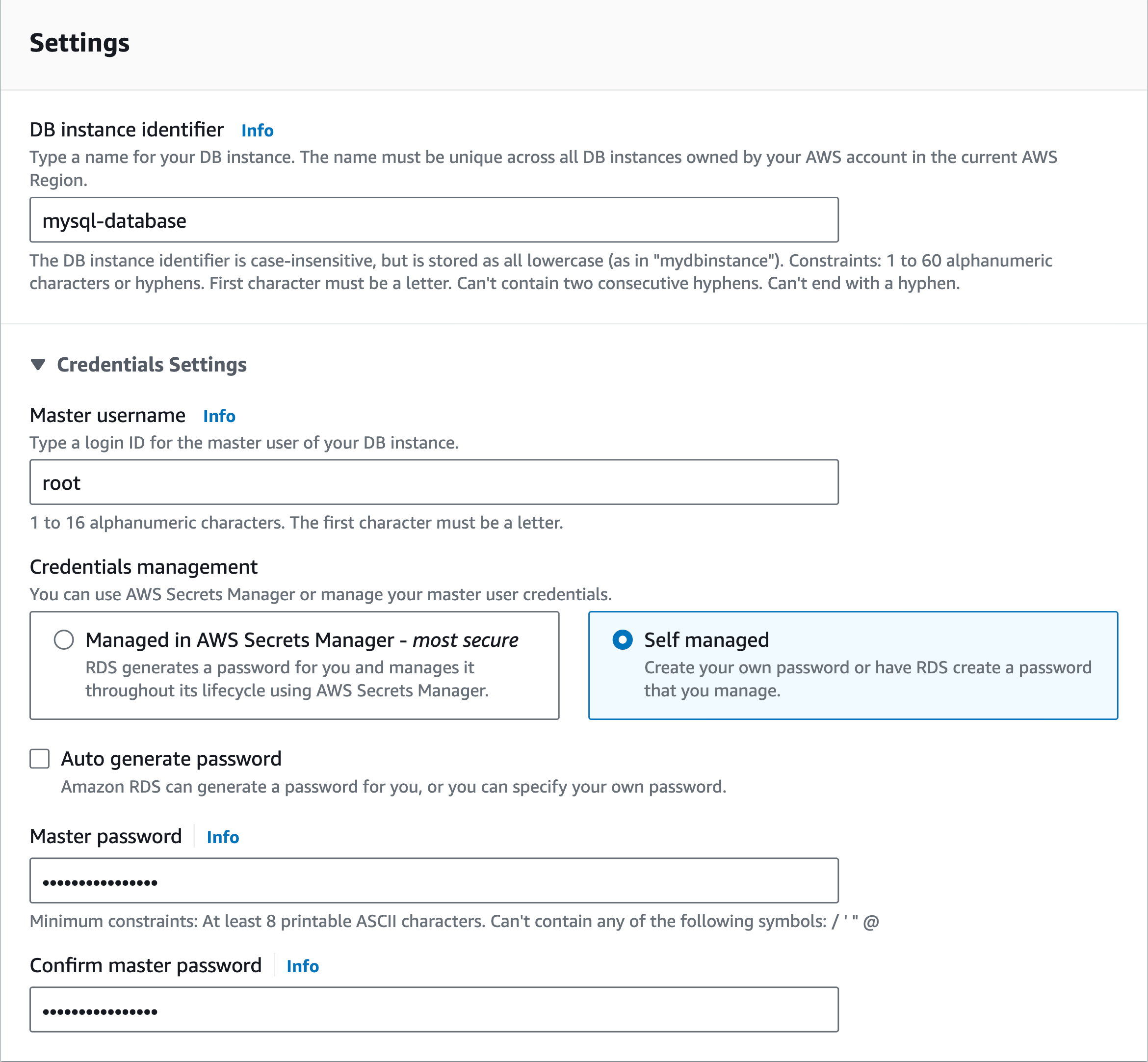 Now we need to provide a name for our database and set up the username and password that will be used to connect to the database. In my case, I set the name as root