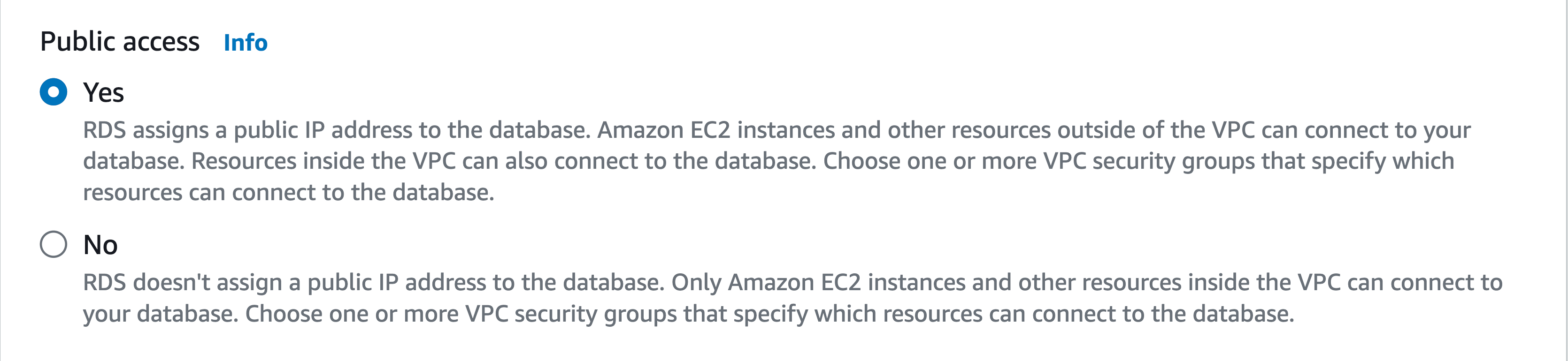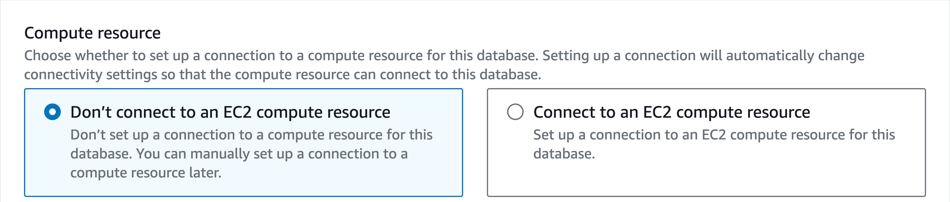 After that, you'll come across a large section on connectivity. There are several key points to consider here. For this chapter, we won't be linking the database to EC2, so choose the option Don't connect to an EC2 compute resource.