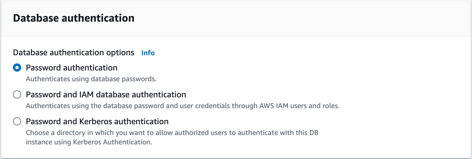 The final point we should focus on is Database authentication. Here, we need to choose Password authentication because it's the easiest and most straightforward type of authentication we currently need.