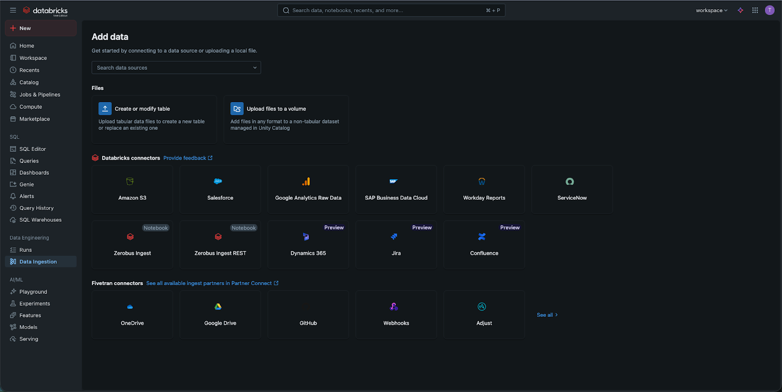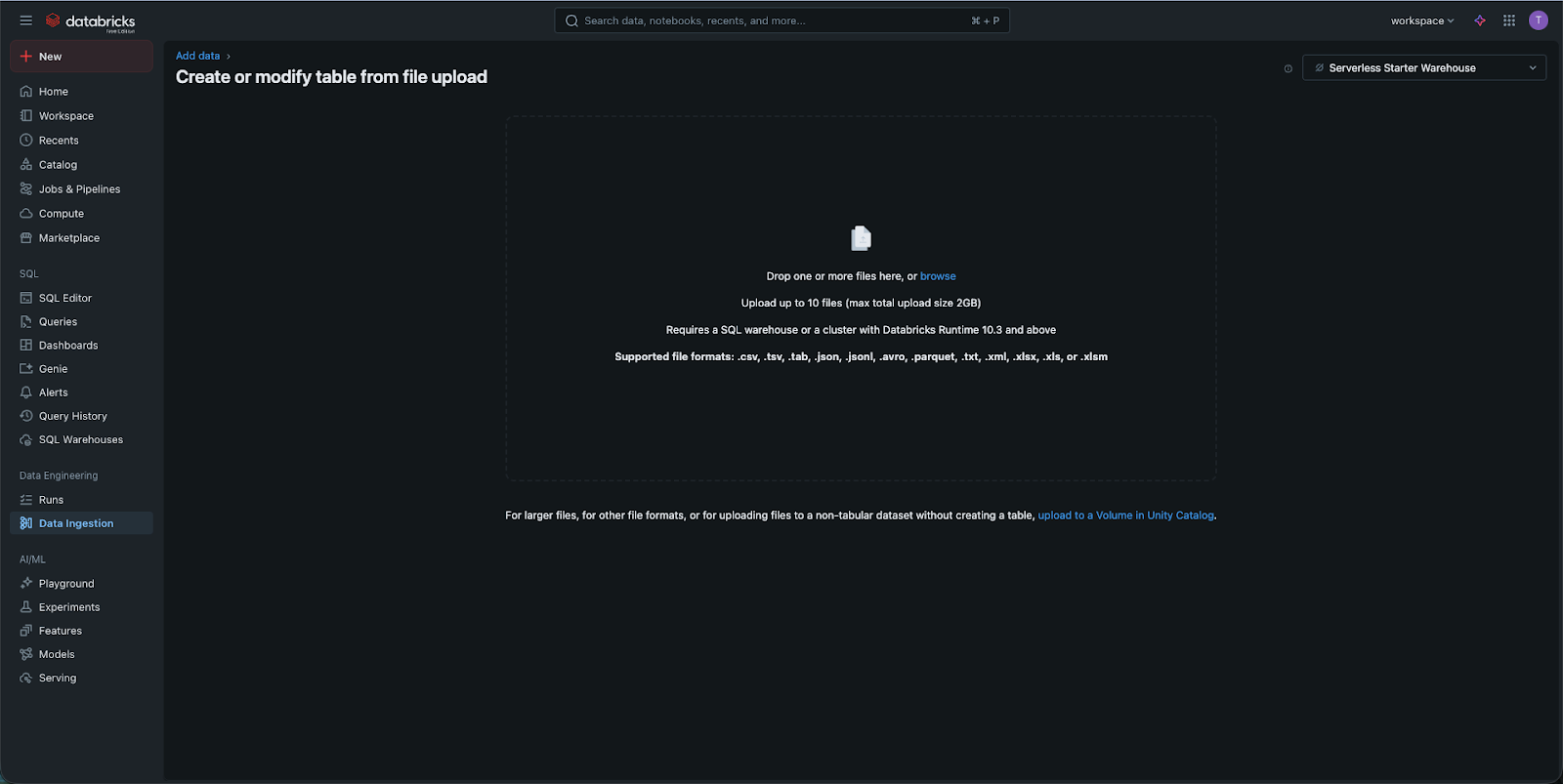 Data Ingestion is the process of bringing data from outside sources into your Databricks environment. Using the Data Ingestion UI, you can transform a raw file, like a CSV, into a structured table in your Catalog with just a few clicks.