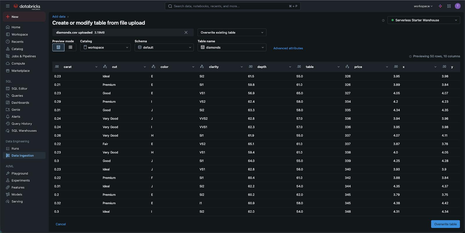 diamonds; - Data Types: Look at the columns. Databricks automatically guesses if a column is a "String" (text), an "Integer" (number), or a "Timestamp" (date). If it guesses wrong, you can manually change the data type right here in the UI.