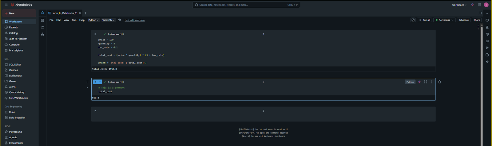 For example, if you create a new cell below the previous one and simply type print(total_cost), it will still remember the value was 550.0. If you restart the cluster or "Clear State," you will need to run the cells again from the top to re-initialize those variables.
