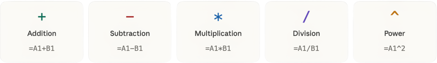 =tells Excel you're writing a formula;FUNCTION_NAMEis the operation (e.g.,SUM,AVERAGE);argumentsare the inputs the function uses (numbers, cells, ranges, structured references).