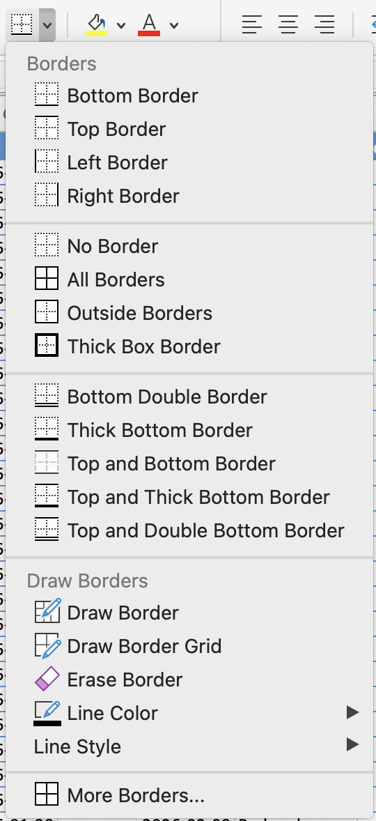 - More Borders: opens Format Cells dialog. Apply borders side by side, set custom line styles and colours, or remove specific edges individually;