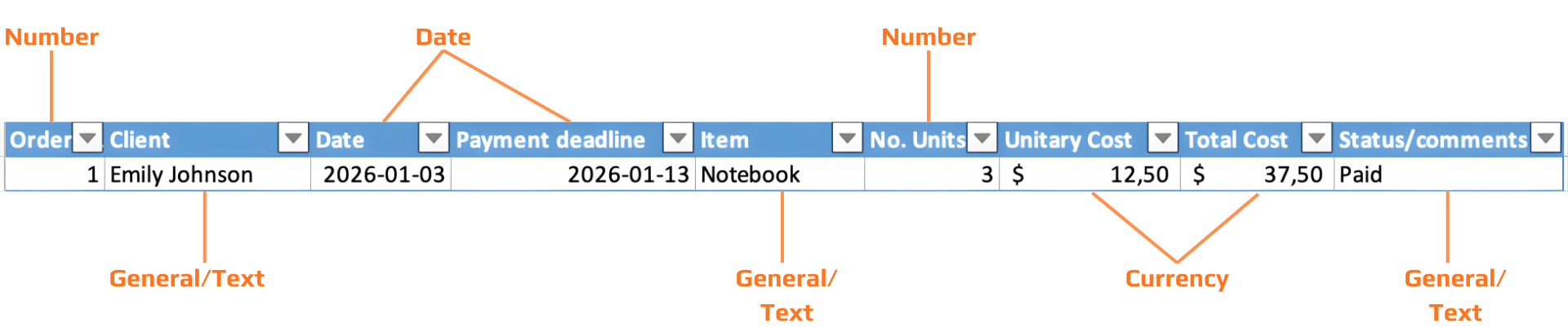 - Currency: monetary values with symbol, number with financial formatting applied;
