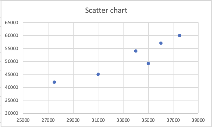 Each dot is a pair of values — one column becomes the X-axis, the other becomes the Y-axis. Used to identify correlation, clusters, or outliers between two numeric variables. Not suitable for categories.