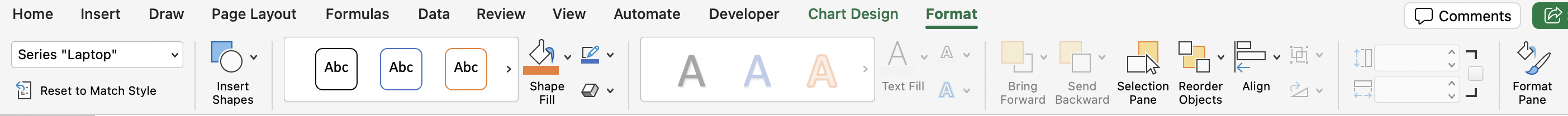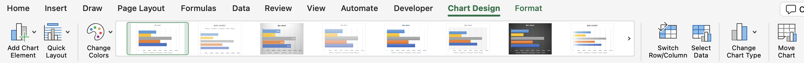 When any chart is selected, two contextual tabs appear in the ribbon: Chart Design and Format.