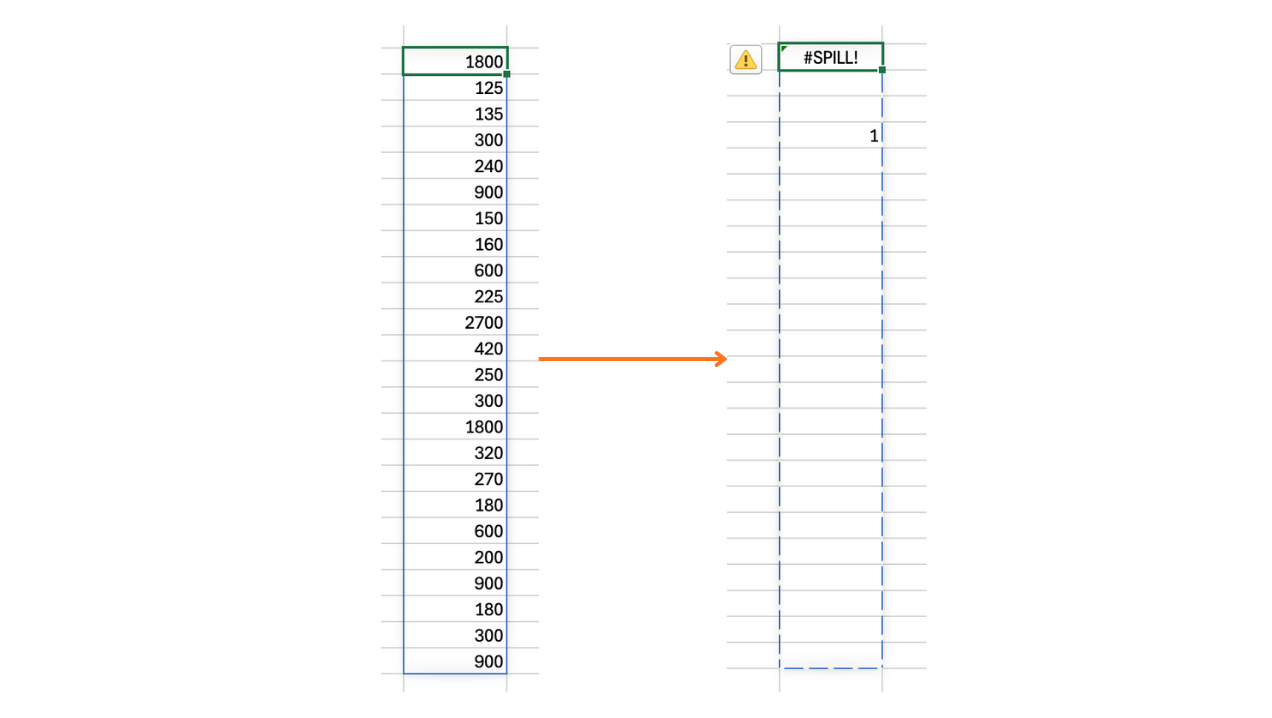 #SPILL!error appears in the formula cell. - Remove the blockage so the formula spills as intended.