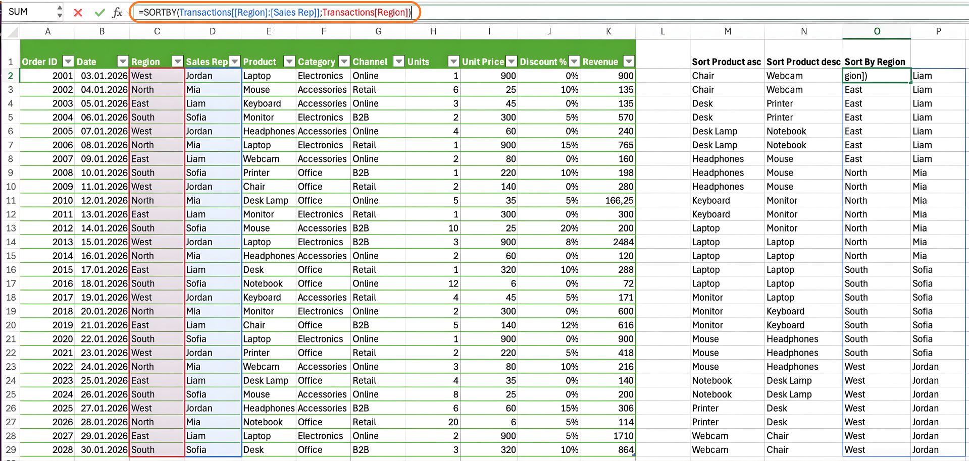 =SORTBY(Transactions[[Region]:[Sales Rep]];Transactions[Region])