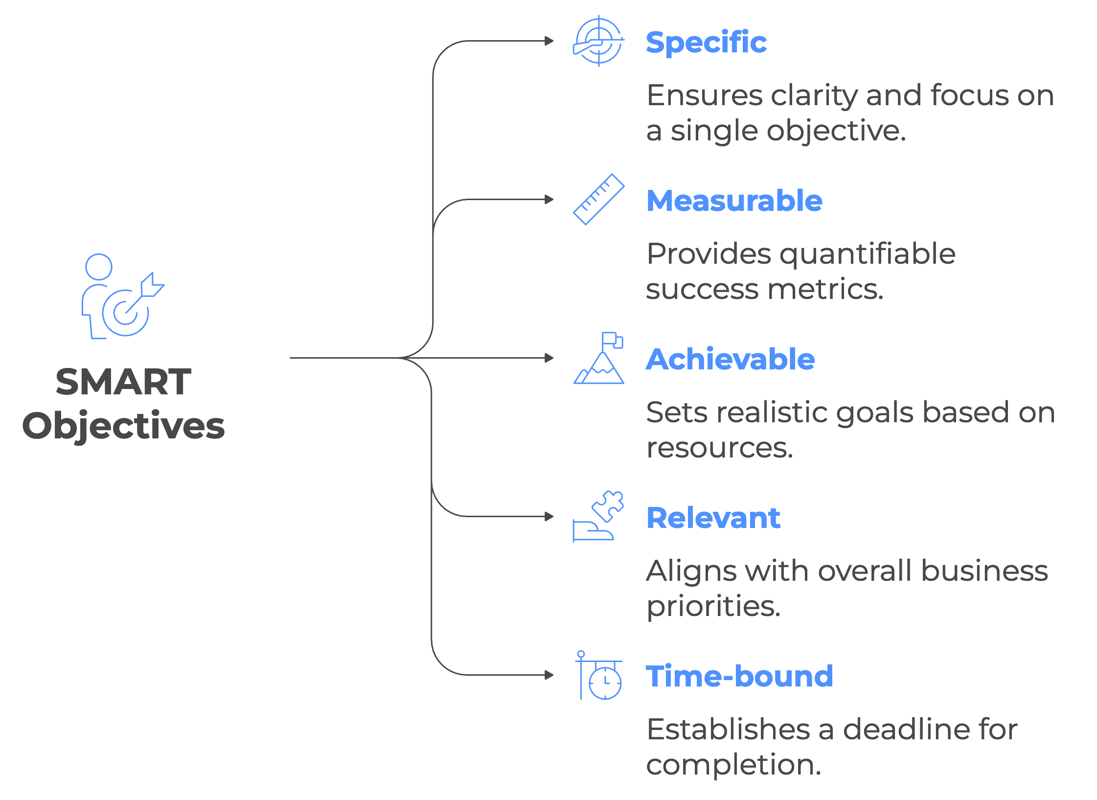 SMART stands for Specific, Measurable, Achievable, Relevant, and Time-bound. These five principles turn vague ambitions into actionable targets that can guide and evaluate marketing success.