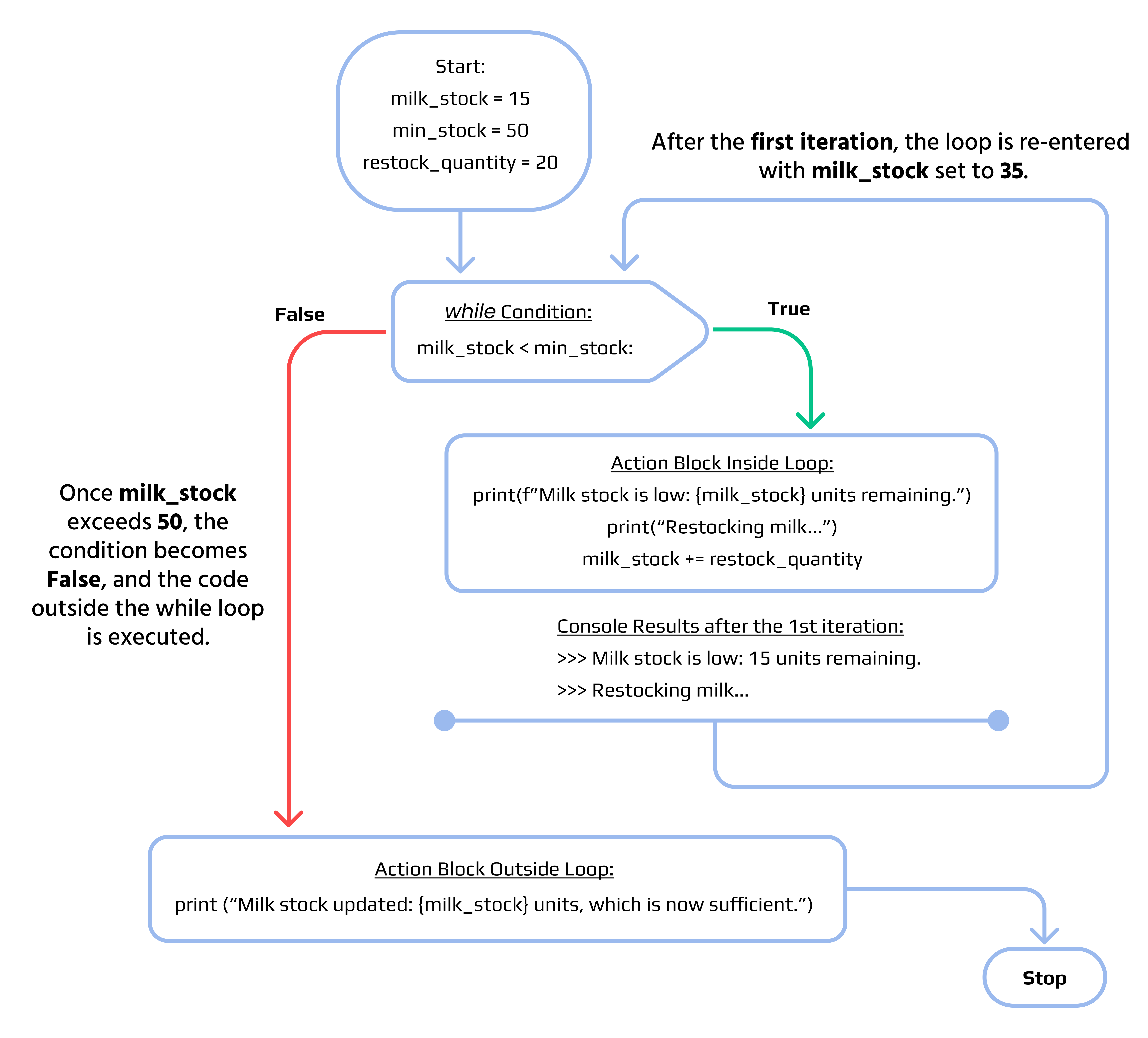 123456789101112131415161718# Initial amount of milk in stock milk_stock = 15 # Minimum stock level before restocking is necessary min_stock = 50 # Quantity a worker can restock at one time restock_quantity = 20 # Start the loop to restock milk until the stock exceeds the minimum required level while milk_stock < min_stock: # If the loop is running, the condition is `True`, indicating we need more milk print(f"Milk stock is low: {milk_stock} units remaining.") # Simulate the process of restocking milk print("Restocking milk...") # Increase the stock by the quantity the worker can bring in one trip milk_stock += restock_quantity # Output the final stock level after restocking is complete print(f"Milk stock updated: {milk_stock} units, which is now sufficient.")