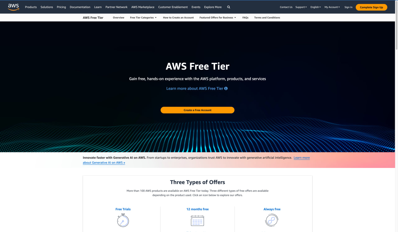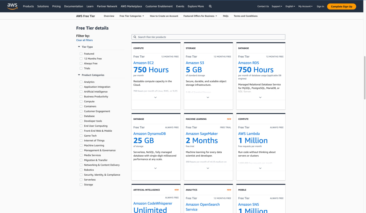 Для початку вивчення та використання AWS необхідно створити обліковий запис для цієї мети. Як показано на скріншоті вище, нас цікавить велика кнопка для створення безкоштовного акаунта. AWS надає безкоштовний обмежений доступ до багатьох своїх продуктів, тому обов'язково скасуйте підписку та керуйте своїми проєктами, якщо ви ще не готові платити. Нижче можна переглянути перелік сервісів, доступних у безкоштовному тарифі: