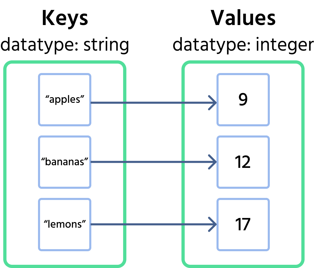 Наступна ілюстрація демонструє приклад словника, який зберігає кількість різних фруктів: